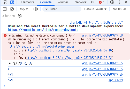경고: 다른 구성 요소('Div')를 렌더링하는 동안 구성 요소('App')를 업데이트할 수 없습니다. 'Div' 내에서 잘못된 setState() 호출을 찾으려면 설명된 스택 추적을 따르세요