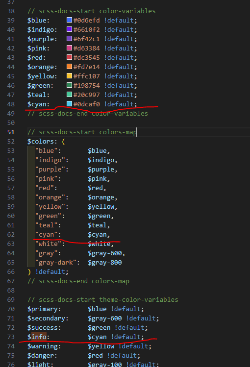 1. 일단 _variables.scss에서 해당 값 찾기 ( $info ) 검색하니 공식 문서와 같은 색상이 나옴