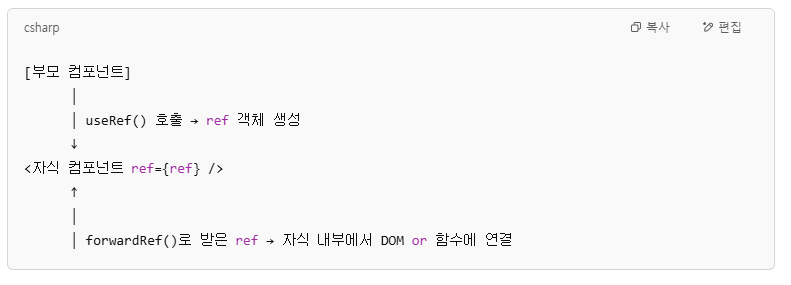 useRef()로 ref 객체 만든다 → ref={...}로 자식에게 전달한다 → forwardRef()로 받은 자식이 내부에서 쓴다