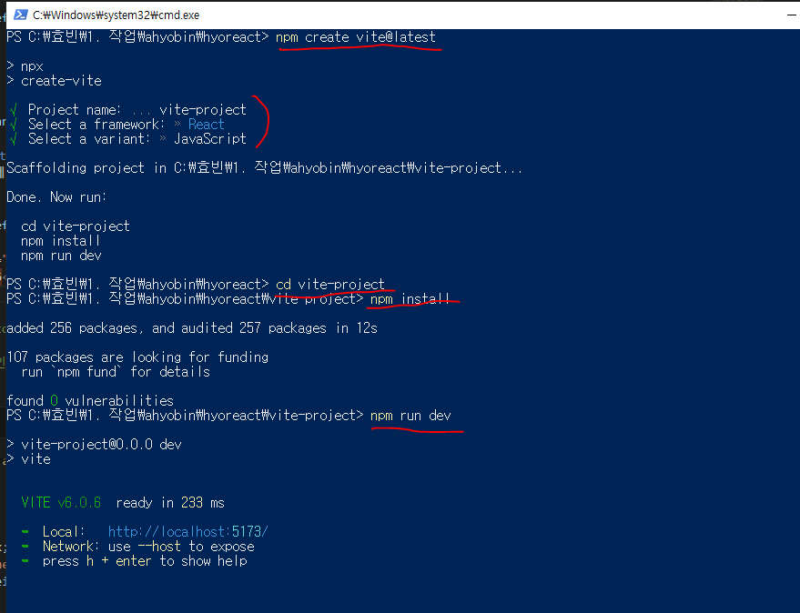 cd vite-project : vite-project 폴더로 이동 (한 폴더 위로 가기 cd ..)